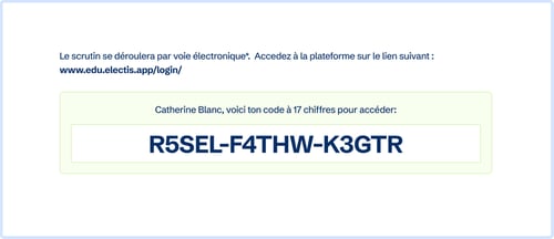 Un code composé de 17 caractères (chiffres et lettres), fourni par courrier, SMS ou e-mail, qui garantit un accès unique à la plateforme de vote.